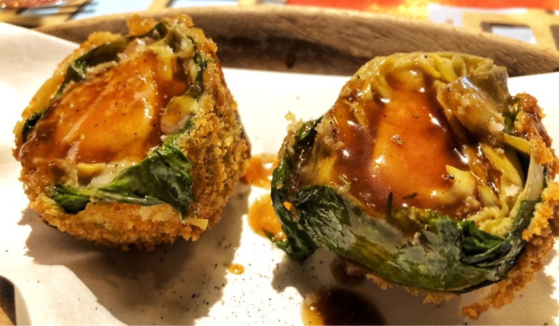 On enchaine avec ce que le chef appelle « las alcachofas del amor », les artichauts d’amour. Un cœur d’artichaut, entouré de feuilles de grelos (légume Galicien entre le brocoli monté et l’épinard) avec un morceau de foie gras au milieu et pané puis frit, servi avec une réduction de fond de veau. Surprenant. Croustifondant, savoureux et extrêmement long en bouche. L’albariño s’accorde parfaitement avec ce met.