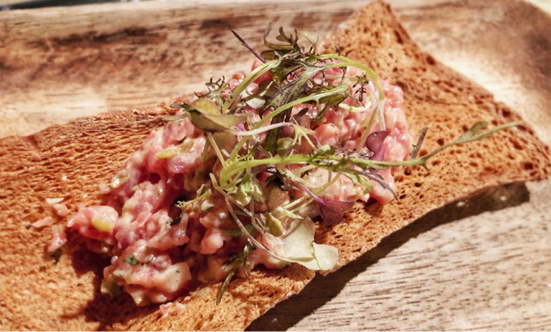 Nous terminons (avant un petit dessert) avec un tartare de veau servi sur une tuile de pain grillé accompagné de jeunes pousses de roquette. Parfait !