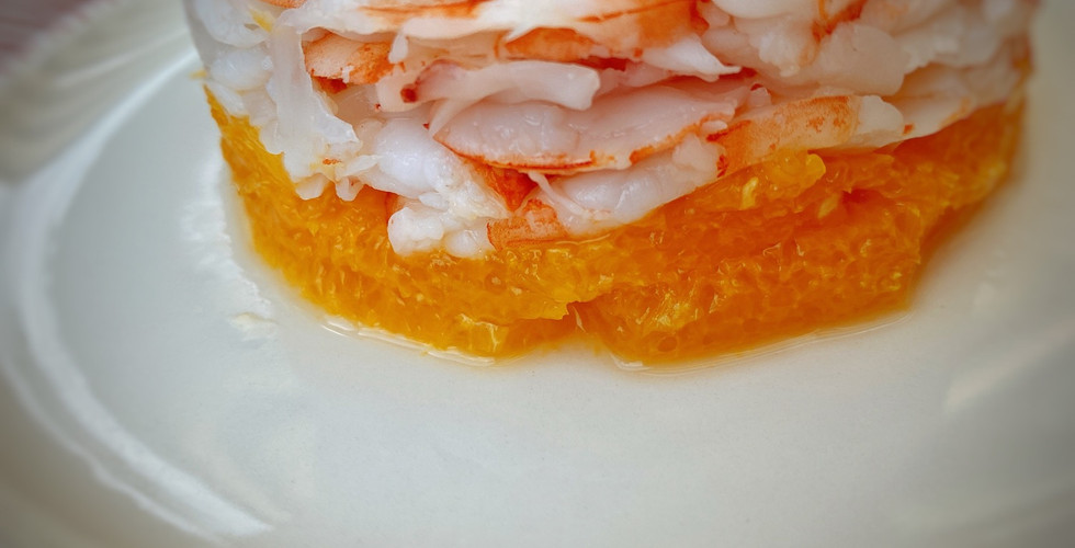 · Escalopes les queues de gambas cuites et en disposer deux ou trois couches par-dessus les suprêmes d’orange